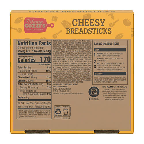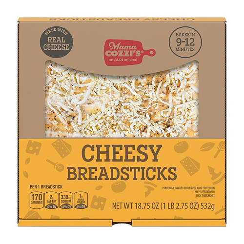 Looking for a quick and easy meal? Look no further. Mama Cozzi's Pizza Kitchen is coming to the rescue in the form of Take and Bake Cheesy Bread Sticks. These breadsticks are made with real cheese, have 0 grams of trans fat, and bake in as little as 7 to 9 minutes. You can enjoy these cheesy breadsticks on your own, dip them in marinara sauce, or top with fresh garlic. Discover all of our delicious and affordable take and bake and deli options at ALDI.