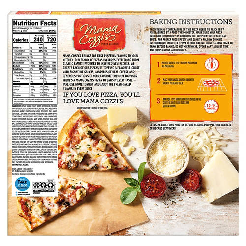 Mama Cozzi's Pizza Kitchen Lemon Pepper Chicken Bruschetta Pizza is topped with lemon pepper tomato sauce, a blend of mozzarella, asiago, parmesan, romano cheeses, garlic herb chicken, fire-roasted tomatoes and basil. This thin-crust pizza offers a delightful combination of flavors perfect for dinner or a quick meal. Crafted with real cheese, it brings a satisfying and delicious taste to your table. Enjoy restaurant-quality pizza at home.