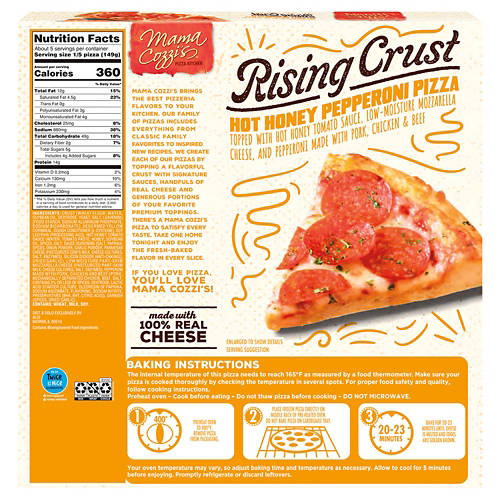Mama Cozzi's Pizza Kitchen Rising Crust Hot Honey Pepperoni Pizza is a delicious blend of hot honey tomato sauce, low-moisture mozzarella cheese and pepperoni made with pork, chicken and beef. Perfect for a quick dinner, this pizza delivers a spicy-sweet flavor with a fluffy crust. Just bake and serve for a satisfying meal. Keep one in your freezer for an easy, tasty dinner option.