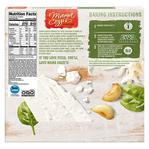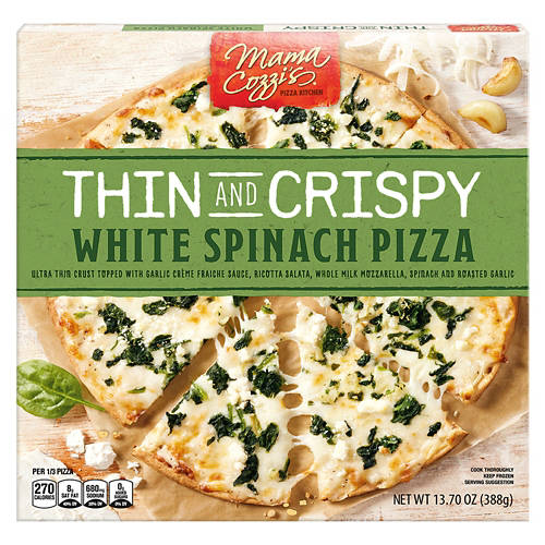 Mama Cozzi's Pizza Kitchen Thin & Crispy White Spinach Pizza is a delightful meal option. This ultra-thin crust pizza is topped with garlic crème fraîche sauce, ricotta salata, whole milk mozzarella, spinach and roasted garlic. It's ideal for a quick dinner or a gathering with friends. Enjoy the blend of rich flavors and crispy texture. Keep this in your freezer for a tasty meal solution.