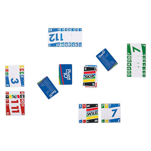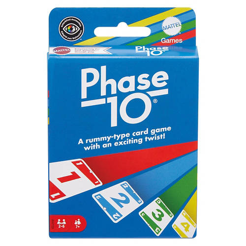 PHASE 10 Card Game - From the makers of UNO™ comes a rummy-type card game with a challenging and exciting twist! The object of the game is to be the first player to complete 10 varied phases with two sets of three, one run of seven, or seven cards with the same color. The twist is that each Phase to be completed is specific for each hand dealt. Players who complete one Phase advance to the next, but those who don't must keep trying until they do. Each deck features “Wild” and Skip” cards, which add excitement and can help you get out of a sticky situation. A “Wild” card can be used in place of a number card, as well as be used as any color to complete any phase, while a “Skip” card causes your opponent to lose a turn! Be the first person to complete all ten phases to win the game. Includes 108 cards and instructions. Colors and decorations may vary. Age Grade: 7Y+