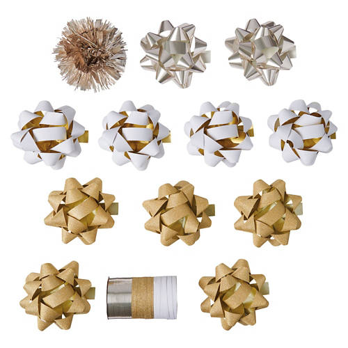 Each set comes with 12 bows, with 4 different types of bows Each bow is 4 in Includes 3 types of ribbon Each ribbon is 18 feet long