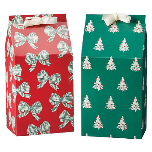 2 Pack Tall Treat Boxes comes with ribbon to tie box closed and is available in 2 different design sets Dimensions of Gingerbread Treat Box: 4 in L x 3 in W x 8 in H Dimensions of Square Treat Box: 8 in L x 8 in W x 4 in H