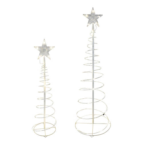 Choice of Warm White or Multi Color lights , set of 2 3ft tree includes 40 LEDs, tree based 9.44 in. dia. (L) 35.43 inches 5.43 inch 35.43 inch 4ft tree includes 60 LEDs, tree based 14.96 in. dia. (L) 47.24 inches Includes 4 legs and 4 tree ground stakes Each tree includes a star tree topper For indoor or outdoor use