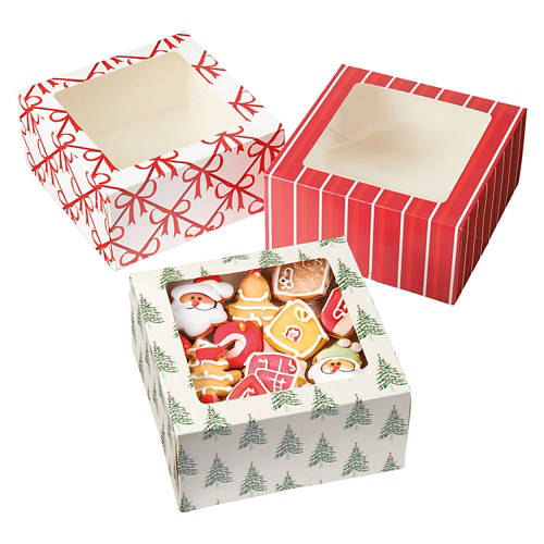 3 Pack Square Treat Boxes is available in 2 different design sets Dimensions of Gingerbread Treat Box: 4 in L x 3 in W x 8 in H Dimensions of Square Treat Box: 8 in L x 8 in W x 4 in H