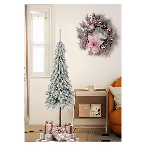 Flocked and pre-lit with warm white LED's 5 foot tree contains 320 flocked pine tips with 70 warm white LED bulbs Each tree includes a flat metal base and wrapped stem Each tree includes a 6 hour timer function w/ Steady LED & Twinkling LED modes. Each tree requires 4 x AA batteries (batteries not included) Indoor use only