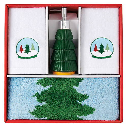 Includes 1 printed bath rug, 2 fingertip towels and 1 lotion pump Polyester rug measures 17" x 24" Cotton towels measure 11" x 18" Lotion pump holds 13.19 fl oz. or 19.40 fl oz. or 22.25 fl oz or 9.45 fl oz depending on design Oeko-Tex Certified
