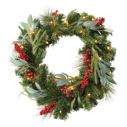 Add a festive look to your front door, entryway, mantel, and more Indoor Use Only Wreath 24 in. diameter Pairs perfectly with our Holiday Garland (Sold Seperately) 25 LED Dual light options - Choose warm white or bright white. Requires 3 x AA batteries (not included)