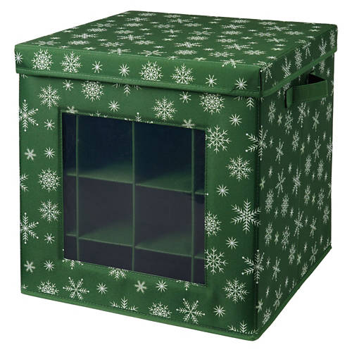 Ornament storage Includes removable dividers and stores up to 48 ornaments Collapsible to save space when not in use Handles on both side Size: 15 in l x 15 in w x 15 in h