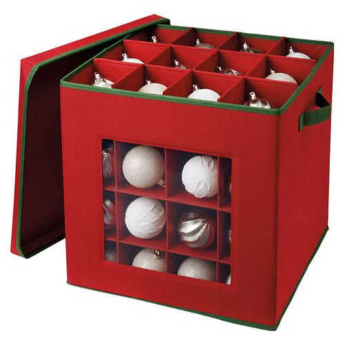 Ornament storage Includes removable dividers and stores up to 48 ornaments Collapsible to save space when not in use Handles on both side Size: 15 in l x 15 in w x 15 in h
