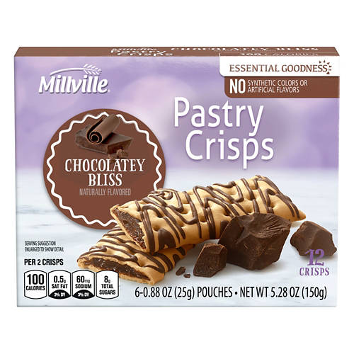 Millville Chocolate Pastry Crisps are a delightful choice for a quick, naturally flavored chocolatey snack. With no synthetic colors or artificial flavors, these crisps are perfect for a midday pick-me-up or a sweet addition to your breakfast. Each pack includes six pouches, making them easy to share or savor over several days. With only 100 calories per serving, indulge guilt-free in the rich, chocolatey taste of Millville Chocolate Pastry Crisps.