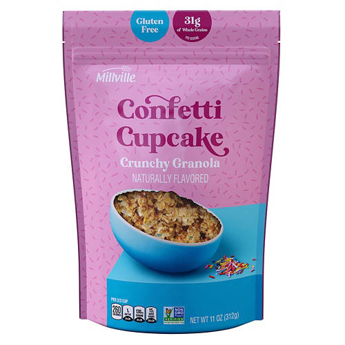 Millville Confetti Cupcake Crunchy Granola is a naturally flavored delight that brings the fun of confetti cupcakes to your breakfast bowl. With 31 grams of whole grains per serving, it's an excellent way to start your day. Enjoy it with milk, sprinkle it over yogurt or eat it straight from the bag for a satisfying crunch. Non-GMO verified and gluten-free, this granola is a tasty and festive addition to your pantry.