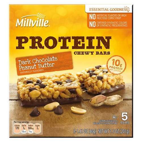 Stay satisfied all afternoon with these Millville Dark Chocolate Peanut Butter Protein Chewy Granola Bars! Each granola bar is packed with 10 grams of protein from hearty peanuts and sweet dark chocolate. With no artificial flavors, colors, preservatives, or high fructose corn syrup, it's perfect for a day at the office or a trip to the beach!