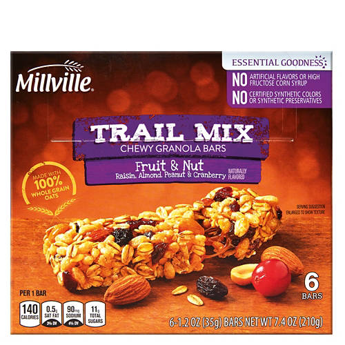 Power through a busy afternoon with these Millville Fruit and Nut Trail Mix Chewy Granola Bars! Each granola bar features whole grain oats, almonds, raisins, peanuts, and dried cranberries and has no artificial flavors, colors, preservatives, or high fructose corn syrup. Bring yours to the office or slip one into your lunch bag for the perfect midday fuel!