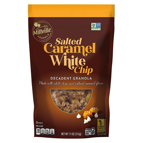 Start your day the right way with this Millville Salted Caramel White Chocolate Chip Granola! Made with non-GMO verified ingredients, the certified gluten free granola features sweet oats, white chocolate chips, & salted caramel pieces for a delicious bite every time. Add yours to a bowl of creamy yogurt and fresh berries to make your morning a little sweeter!