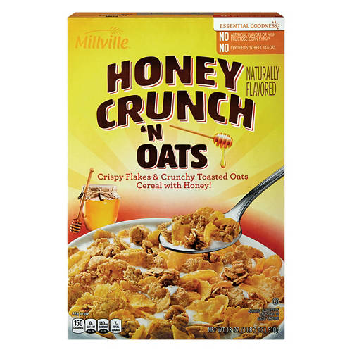 Millville Honey Crunch 'n Oats Original Cereal is the breakfast you need to kickstart your day. Enjoy crispy flakes and crunchy toasted oats naturally flavored with honey for a deliciously sweet start. Pair with milk or yogurt for a satisfying meal or enjoy straight from the box for a quick snack. With no artificial flavors, high fructose corn syrup or certified synthetic colors, it's a choice you can feel good about.