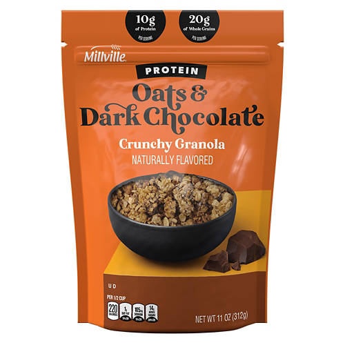 Instantly elevate your morning with this Millville Oats 'n Dark Chocolate Protein Crunchy Granola! The crunchy granola features hearty whole grain oats, dark chocolate chunks, and 10 grams of protein per serving. Enjoy yours with a cold glass of milk, on top of sweet oatmeal, or mixed into a cup of creamy yogurt!
