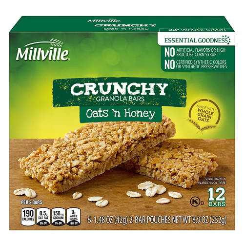 Stay satisfied all afternoon with these Millville Oats 'n Honey Crunchy Granola Bars! The crispy granola bars are made with whole grain oats and come in convenient twin packs. With no artificial colors, flavors, preservatives, or high fructose corn syrup, they're the perfect snack for a busy day at the office or a packed school day!