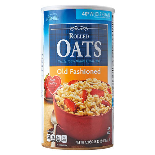 Complete your morning with these Millville Old Fashioned Rolled Oats! The whole grain oats are tasty, healthy, and good for your heart. Enjoy yours with fresh berries in a classic bowl of oatmeal, or turn them into moist muffins, sweet pancakes, or homemade granola for a fun twist!