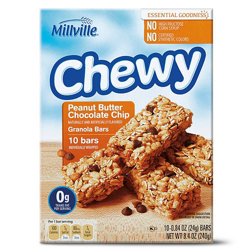These Millville Chewy Peanut Butter Chocolate Chip Granola Bars are the perfect blend of sweet and salty! The chewy granola bars are made with sweet chocolate chips and salty peanut butter chips for a delicious bite every time. With no added colors or high fructose corn syrup, they're the ultimate addition to your office bag or your kiddo's lunchbox!