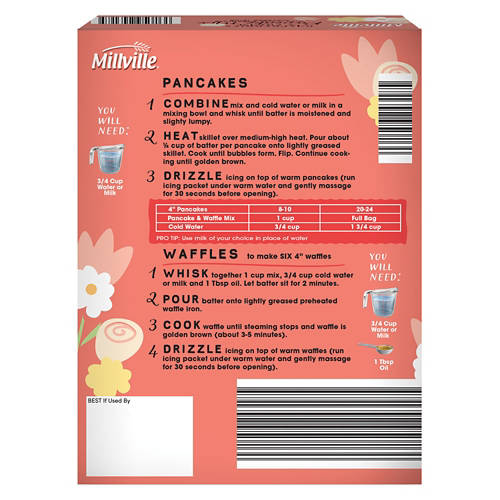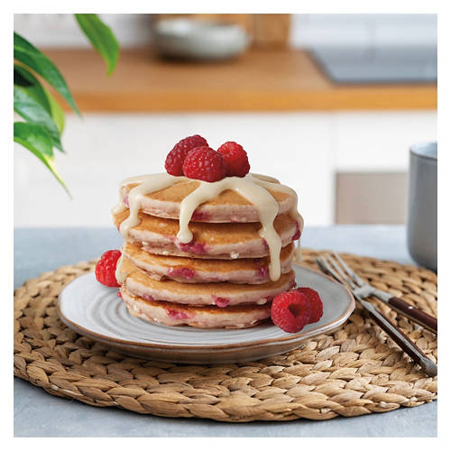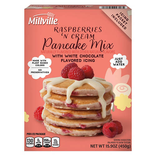 Millville Raspberries 'n Cream Pancake Mix delivers a delectable breakfast experience with its naturally flavored mix and white chocolate flavored icing. Made with plant-based colors and no preservatives, it’s perfect for a quick and delightful morning treat. Simply add water, cook and enjoy fluffy pancakes with a sweet raspberry twist. Ideal for a weekend brunch or a special breakfast, this pancake mix promises a satisfying start to your day.