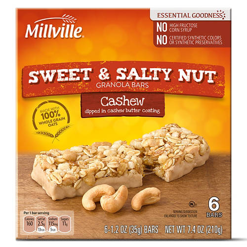 Take your snack break to the next level with these Millville Sweet & Salty Nut Cashew Granola Bars! Each granola bar is made with whole grain oats, crunchy cashews, and sweet cashew butter and has no artificial colors, preservatives, or high fructose corn syrup. Enjoy yours at the office, at home, or while running errands downtown to power through the day!