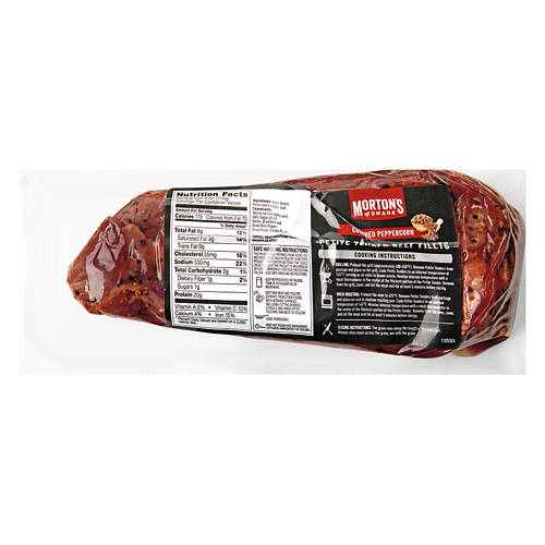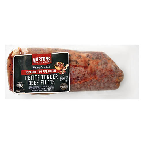 Morton's of Omaha Crushed Peppercorn Petite Tender Beef Filets are ready to cook, making them a quick and easy meal solution. These beef filets are coated with seasoning and have smoke flavor added for a delicious taste. Ideal for grilling, these filets provide a flavorful and tender meat option for your meal. Elevate your dinner with Morton's of Omaha Petite Tender Beef Filets.