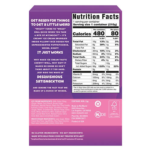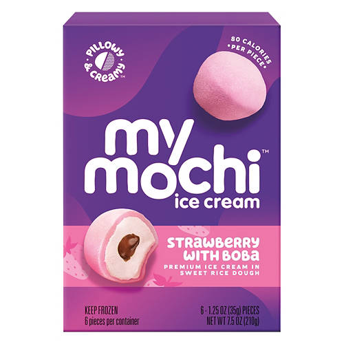 My/Mochi Strawberry Boba Mochi Ice Cream offers a delightful fusion of flavors and textures. Each bite reveals a creamy strawberry ice cream center wrapped in sweet rice dough with boba pearls for an extra burst of fun. Perfect for dessert or a midday indulgence, these mochi pieces are a unique treat. With only 80 calories per piece, My/Mochi Strawberry Boba Mochi Ice Cream makes a satisfying dessert choice.