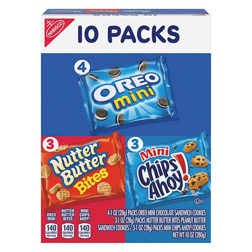This Nabisco Mini Variety Pack Cookies offers a delightful assortment of your favorite cookies in 10 packs. Enjoy 4 packs of Oreo Mini Chocolate Sandwich Cookies, 3 packs of Nutter Butter Bites Peanut Butter Sandwich Cookies and 3 packs of Mini Chips Ahoy Cookies. They're a great option for a quick treat. Perfect for lunches, on-the-go or a sweet snack, Nabisco Mini Variety Pack Cookies brings variety and sweetness to your day.
