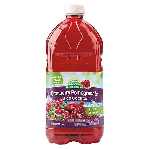 Nature's Nectar Cranberry Pomegranate Juice Cocktail is made with real fruit juice for a refreshing taste. This flavorful blend provides 100% daily value of Vitamin C per serving. Enjoy it chilled on a hot day or mix it into your favorite cocktails for a fruity twist. Experience the delicious blend of cranberry and pomegranate today.