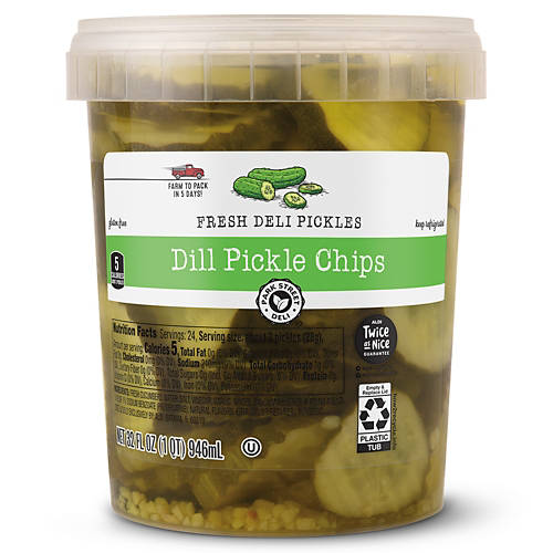 Park Street Deli Dill Pickle Chips are the tangy addition your meals need. These fresh deli pickles are farm to pack in just five days ensuring crispness in every bite. Perfect for adding a zesty crunch to your sandwiches, burgers or even as a side. With only five calories per serving, indulge guilt-free. Make Park Street Deli Dill Pickle Chips a staple in your fridge for that extra burst of flavor.