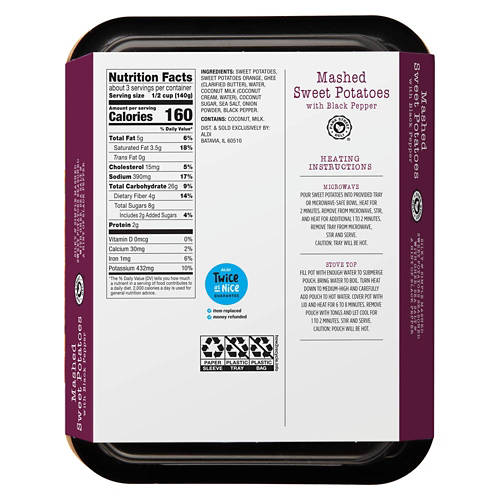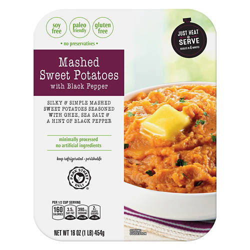 Park Street Deli Gluten Free Mashed Sweet Potatoes with Black Pepper are deliciously simple mashed sweet potatoes seasoned with ghee, sea salt and a hint of black pepper. These mashed sweet potatoes are minimally processed with no artificial ingredients. Just heat and serve for a tasty side dish ready in minutes. Make mealtime easy with this flavorful option.