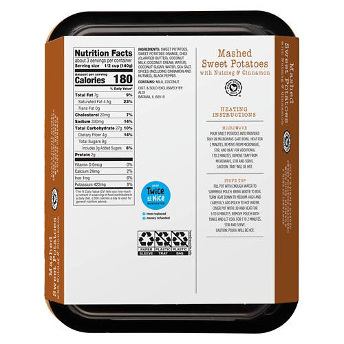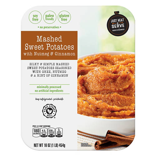 Park Street Deli Mashed Sweet Potatoes with Nutmeg & Cinnamon offers a silky and simple side dish seasoned with ghee, nutmeg and a hint of cinnamon. These mashed sweet potatoes are minimally processed with no artificial ingredients. Just heat and serve for a quick and delicious addition to any meal. Enjoy the rich flavors and smooth texture that make this dish a standout choice. Enjoy a tasty side dish in minutes.