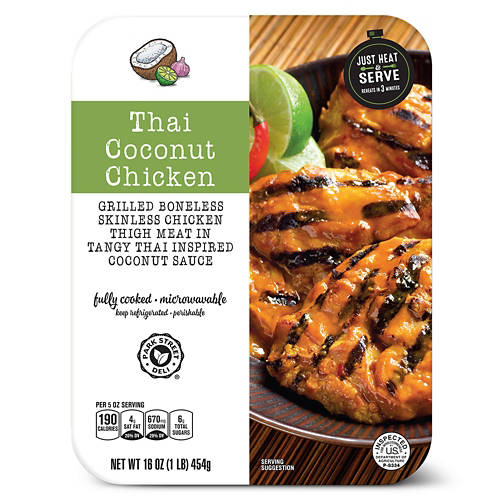 Add something new to your dinner rotation with this Park Street Deli Thai-Inspired Coconut Chicken! Each skinless and boneless griled chicken thigh sits in a tangy Thai-inspired coconut sauce. Enjoy yours with your favorite veggies for a tasty and filling meal!