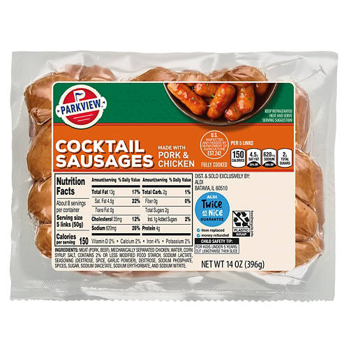 Parkview Cocktail Sausages are made with pork and chicken for a deliciously savory taste. These fully cooked sausages are perfect for heating and serving as appetizers at your next gathering or adding to your favorite recipes for an extra burst of flavor. With 8 servings per package, they are ideal for sharing. Keep them refrigerated and enjoy the convenience of having a tasty option on hand.