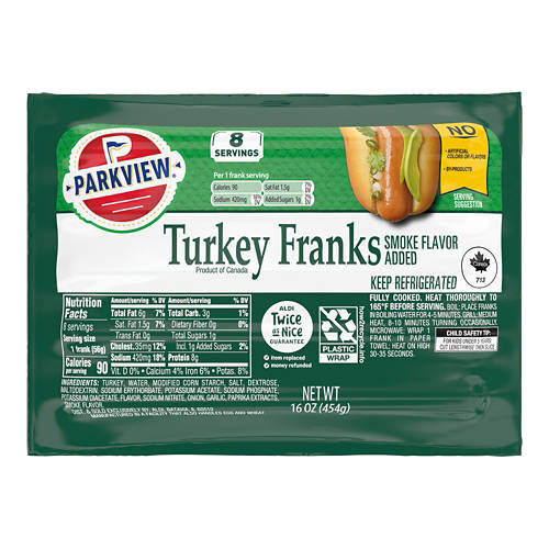 Parkview Turkey Franks deliver a delicious, smoky flavor with every bite. Fully cooked and ready to heat, these franks are perfect for quick dinners or summer barbecues. Simply boil, grill or microwave them and enjoy in hot dog buns with your favorite toppings. With no artificial colors or flavors and no by-products, Parkview Turkey Franks are a savory choice your family will love.