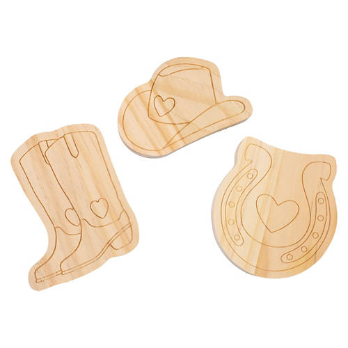 Each kit includes 3 wooden cutouts Comes with 2 paint brushes, 1 flat paint brush and 1 pointed paint brush for fine details Includes 6 paint pots