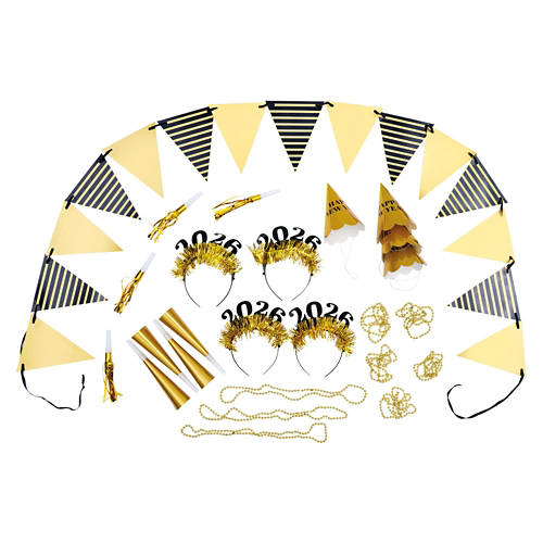New Year's Eve Party Kit Comes with 25 pieces Each kit includes 4 Party Hats, 4 Headbands, 8 Necklaces, 4 Horns, 4 Fringe Blowers, and 1 Banner This value-packed New Year's Eve Party Kit has enough party supplies to host up to 8 guests