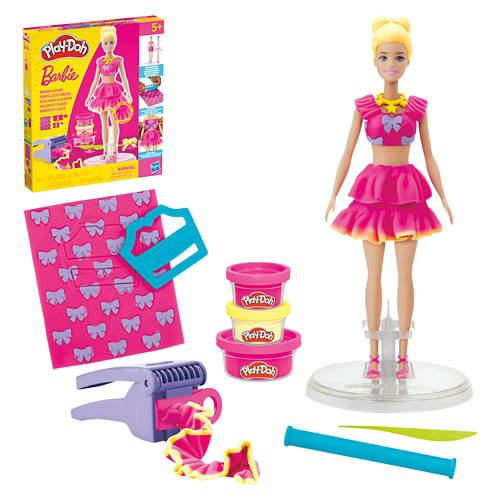 Create super cute styles with a Play-Doh Barbie doll set! It's easy and fun to make Play-Doh Barbie doll clothing with this arts and crafts kit. Just place the doll on the stand, use the Play-Doh pattern sheet and cutters to cut Barbie outfits, and dress her up in the most creative ways imaginable. Give her Play-Doh hairstyles with the mold or kids can make their own by hand. Add Barbie doll accessories like shoes to complete her look. Keep the imaginative play going with the included cans of Play-Doh modeling compound to add even more details. Ages 5 years and up