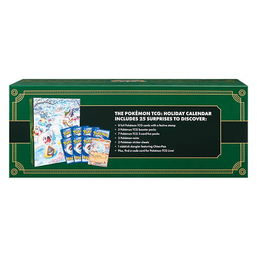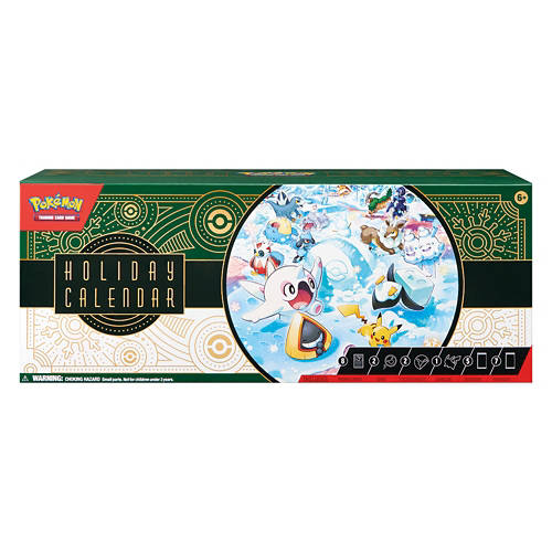 Great Holiday fun for the Pokémon fan everywhere! Includes the following: The Pokémon TCG: Holiday Calendar includes tons of surprises to discover. Pokémon TCG cards with a festive stamp, Pokémon TCG booster packs, Pokémon TCG 3-card fun packs, Pokémon coins, Pokémon sticker sheets, sidekick dangler, Plus, find a code card for Pokémon TCG Live!