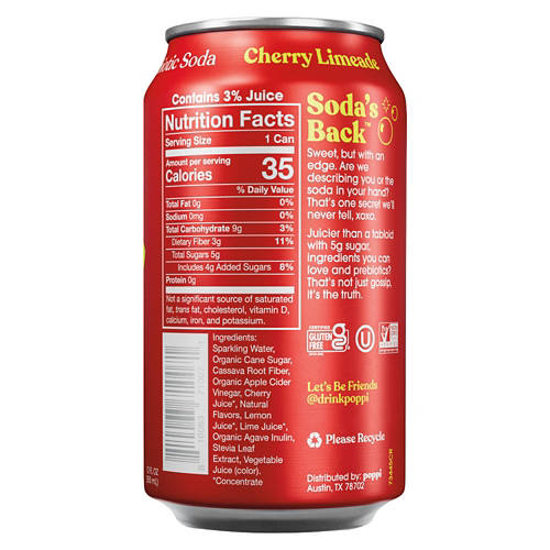 Poppi Cherry Limeade Soda delivers a delightful burst of cherry and lime flavors with only 5g of sugar. Refreshing and fizzy, it’s perfect for quenching your thirst on a hot day. Enjoy this soda chilled straight from the can or pour it over ice for an invigorating experience. Poppi Cherry Limeade Soda brings a refreshing twist to your beverage selection.