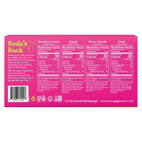 This Poppi Prebiotic Soda Variety Pack offers a refreshing twist on your favorite fizzy drinks. This pack includes Strawberry Lemon, Orange, Cherry Limeade and Grape flavors. Each can contains just 5g of sugar, making it a lighter choice for your soda cravings. Enjoy these prebiotic sodas on their own or mix them into creative mocktails. Elevate your beverage game with Poppi's bold flavors and better ingredients.