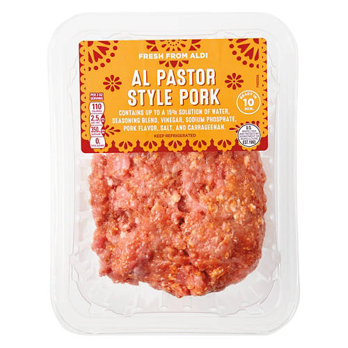 Fresh From Aldi Al Pastor Style Pork is a flavorful and convenient option for quick meals. Ready in just 10 minutes, this pork is perfect for tacos, burritos or salads. Add a delicious and easy protein to your meal rotation with Fresh From Aldi Al Pastor Style Pork.