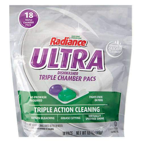 Radiance Ultra Triple Chamber Dish Pacs make dishwashing effortless with no prewash needed. These triple action cleaning pacs excel in oxygen bleaching, cutting grease and delivering a virtually spot-free shine. Perfect for tackling stuck-on food and ensuring your dishes come out sparkling clean every wash. Simplify your kitchen routine and experience the superior cleaning power of Radiance Ultra Triple Chamber Dish Pacs.