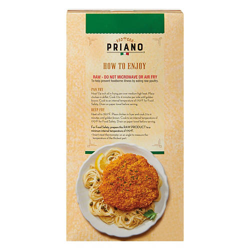 Making a delicious Italian dinner is quick and easy with these Priano Breaded Chicken Parmesan Patties! Each protein-packed chicken patty is finished with a crispy breading infused with fresh parmesan cheese. Team yours with tender pasta and rich tomato sauce for a hearty and tasty meal in minutes.