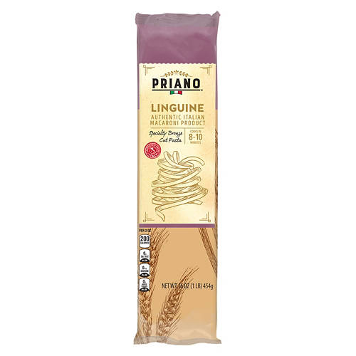Priano Bronze Cut Linguine brings authentic Italian flavor to your table. This specialty bronze cut pasta cooks in just 8-10 minutes, making it an ideal choice for busy weeknight dinners. Pair it with your favorite marinara or Alfredo sauce for a satisfying meal. Whether you're cooking for a family dinner or a romantic date night, this linguine is sure to impress. Enjoy the taste of Italy with Priano.