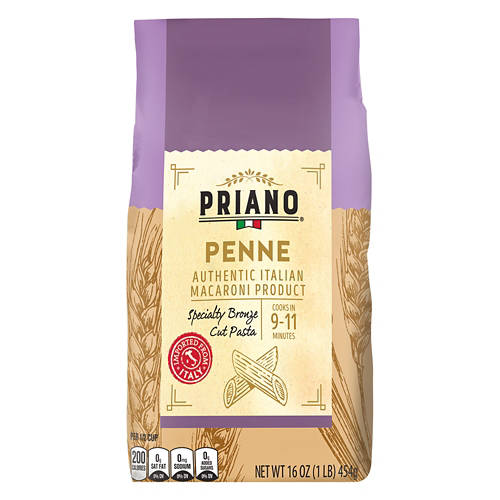Priano Bronze Cut Penne is the authentic Italian pasta your meals need. Its unique bronze-cut texture absorbs sauces beautifully for a flavorful bite every time. Ready in just 9-11 minutes, it’s perfect for quick weeknight dinners. Pair it with your favorite marinara or Alfredo sauce. Make dinner special with Priano Bronze Cut Penne.