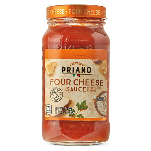 Try something new during your next night in with this Priano Four Cheese Sauce! The classic tomato-based pasta sauce features crumbles of four delicious cheeses for an extra burst of flavor in every bite. Pair yours with tender pasta, seasoned ground beef, and a slice of fresh garlic bread for a delicious and filling dinner!