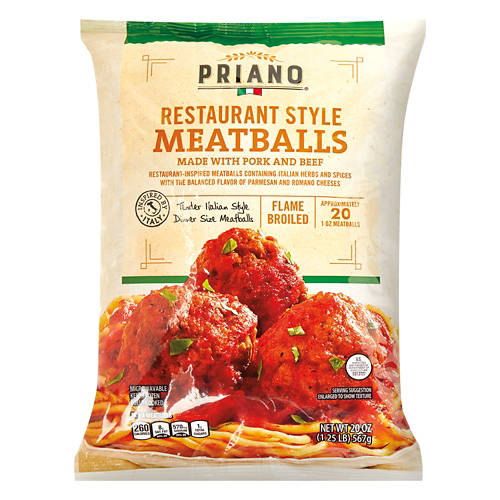 Priano Restaurant Style Meatballs bring authentic Italian flavor to your table. Made with pork and beef and seasoned with Italian herbs and spices, these flame-broiled meatballs are perfect for pasta dishes, sandwiches or on their own. Each package contains approximately 20 meatballs, making it easy to serve a crowd. Enjoy the rich taste of Priano Restaurant Style Meatballs in your next meal.