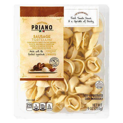 Priano Sausage Tortelloni combines slow roasted sweet Italian sausage with ricotta, mozzarella, parmesan cheese and Calabrian pepper in thinly rolled egg pasta. Ready in just 2 minutes, this delicious dish is a convenient lunch or dinner option on busy days. Serve with fresh tomato sauce and a sprinkle of parsley for a quick meal that tastes like it’s straight from Italy.